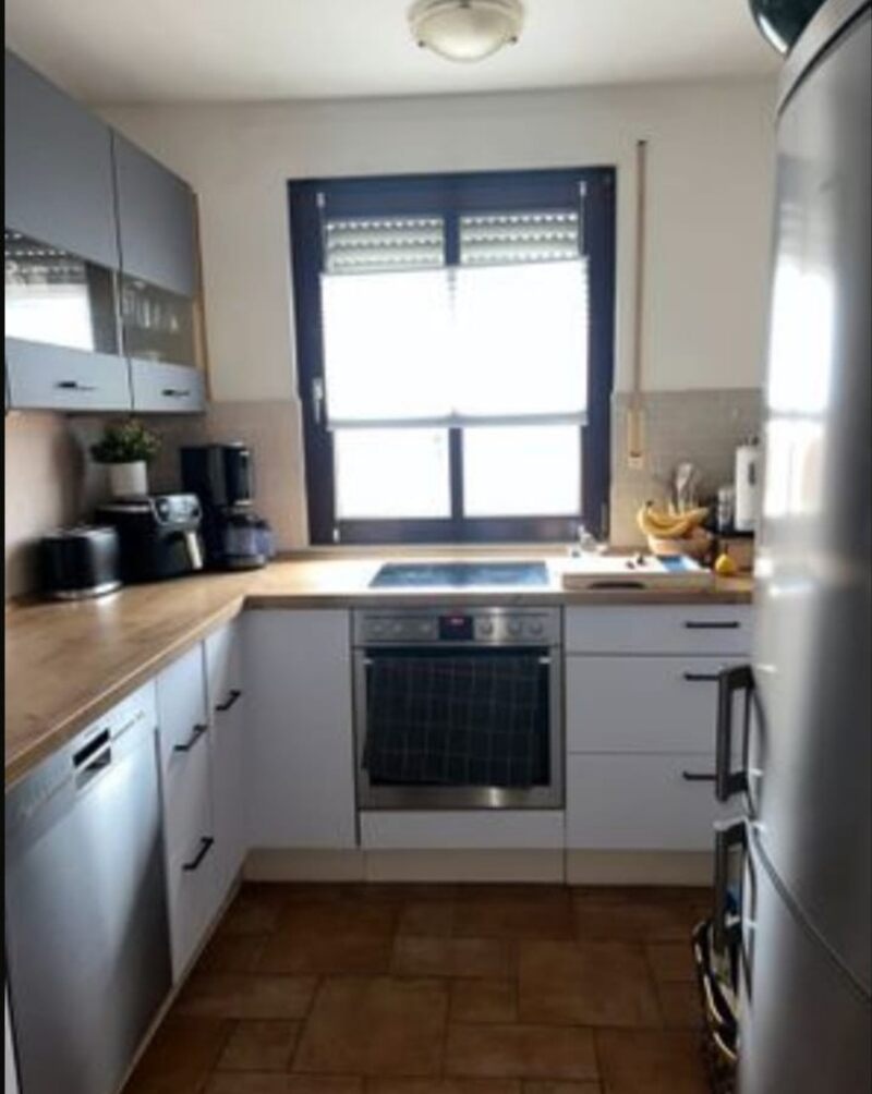Nabízím k prodeji moderní šedou kuchyňskou linku s vestavěnými spotřebiči a pracovní deskou z masivu.