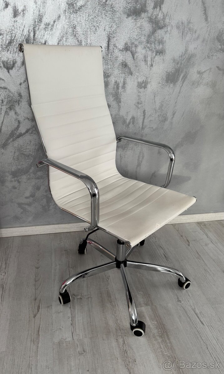 Predám otočnú kancelársku stoličku na kolieskach. Materiál biela koža. Gumové kolieska pre hladký chod po tvrdej podlahe.