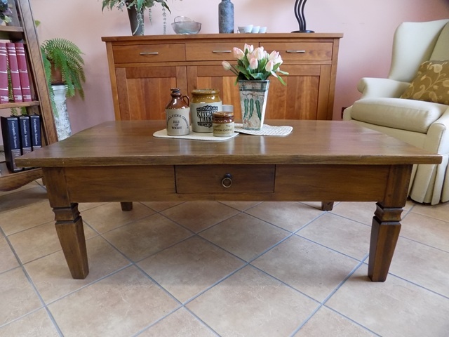 Ponúkam na predaj konferenčný stolík koloniál z masívneho dreva s jednou zásuvkou. Stolík má nohy s rezbou a čapovanie.