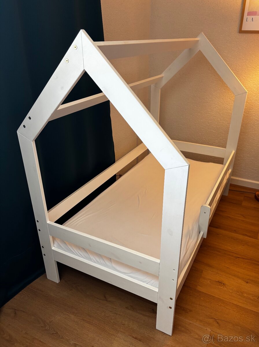 Predám detskú postieľku v tvare domčeka pre matrac 80 x 160 cm. Vonkajšie rozmery postieľky 86 x 164 x 143 cm. Pod posteľou je voľný priestok preto sa ľahko pod ňou vysáva. Výška priestoru pod posteľou je 20 cm. Výška roštu bez matraca je 25 cm.