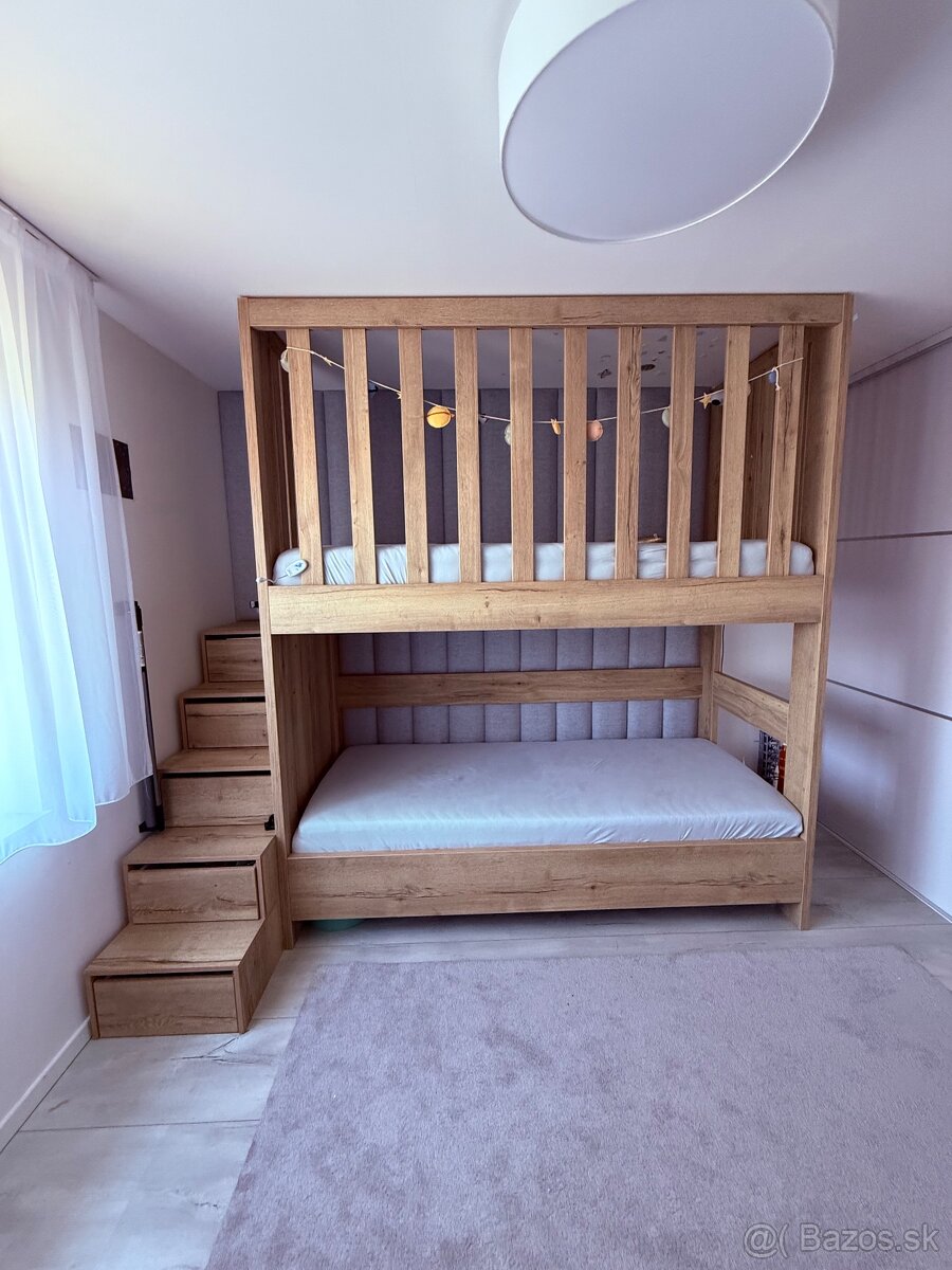 Predám dizajnovú kvalitnú poschodovú posteľ vyrobenú na mieru u stolára. Posteľ je veľmi pevná, stabilná a nevrzga.