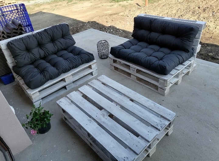 Predám 3 sezóny používané paletové sedenie pod prestrešenou terasou, 2 lavice + stôl a matrace, cena 100 eur za všetko spolu na foto. Iba osobný odber