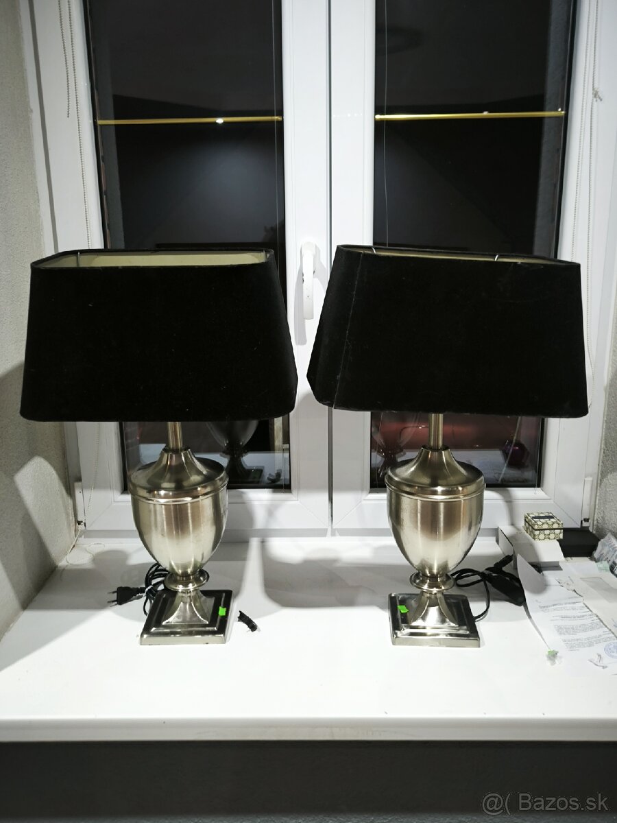 Ponúkam na predaj dvojicu stolových lámp v elegantnom klasickom dizajne. Lampy majú masívnu kovovú základňu vo farbe antického bronzu a tienidlá v tvare kvetu.
