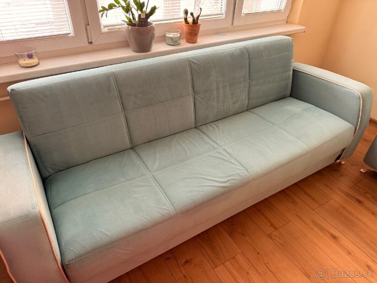 Predám tyrkysovú sedaciu súpravu 3+2+1 v zachovalom stave. Sedacia súprava je nevysedená, trojsedačka po oprave dosky pod sedákmi, čalúnenie neutrpelo. Minimálne známky používania. Trojsedačka a dvojsedačka sa dajú rozložiť do roviny na spacie lôžka. Obe majú úložný priestor. Sedačky boli čerstvo vytepované. Predávajú sa so štyrmi vankúšikmi.