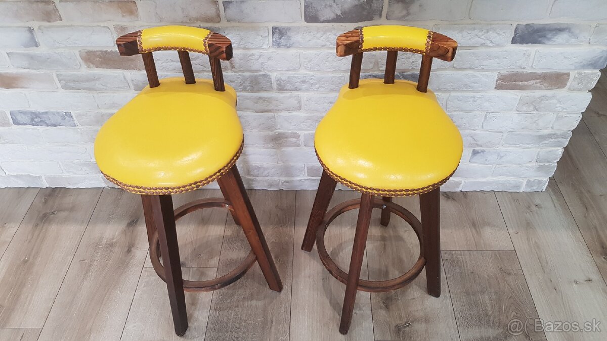 Predám 2 ks barových stoličiek. Sú vyrobené z masívneho dreva, sedák je otočný na kovovom ložisku a otapacírovaný koženkou. Používali sa minimálne, skôr ako dekorácia. Rozmery sú uvedené vo fotkách v galérii. Len osobný odber.