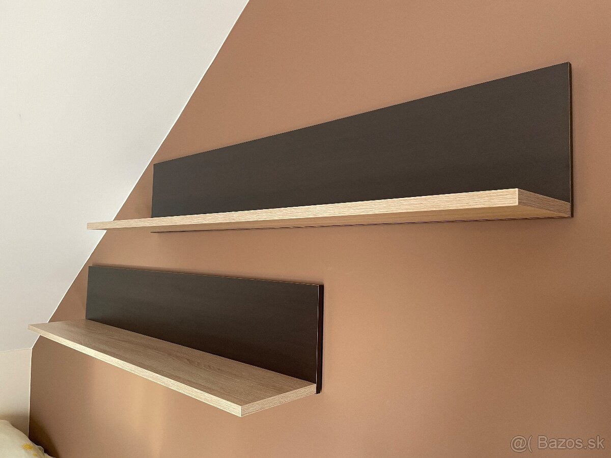 Dve závesné police v drevennom dekore,dvojfarebné, materiál dyhovaná drevotrieska,pekné bez poškodenia-ako nové,rozmery - d: 140 cm, v: 26 cm, h: 24 cm, uchytenie závesom je v troch miestach. Osobný odber,neposielam. Akékoľvek otázky rada zodpoviem:)