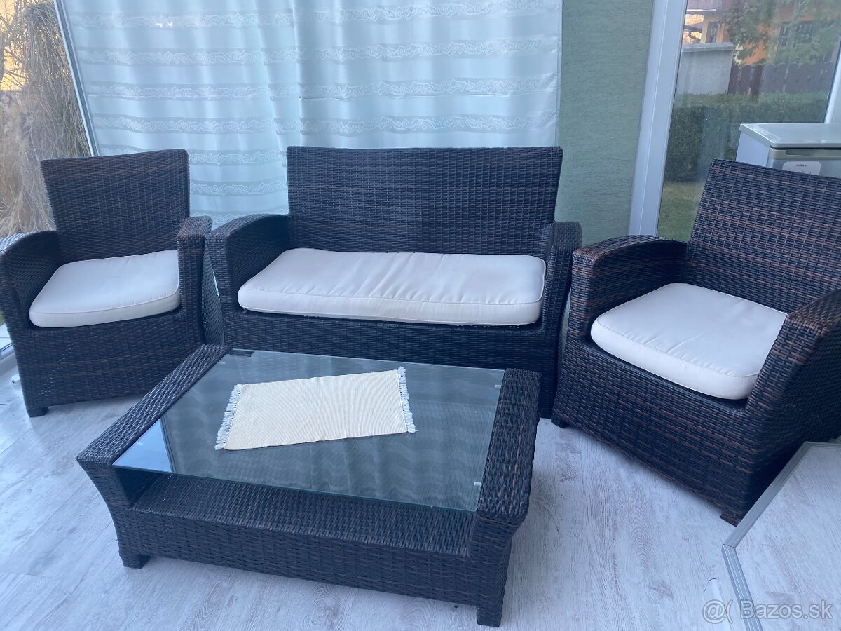 Ratanova zostava - [18.3. 2026]Ponúkam na predaj používaný ratanovy nábytok, stolik(145x 70cm, výška 67) na vrchu je hrubé bezpečnostné čierne sklo,n gauč-175cm (3 sedadla), 2x kreslo( 65cm široké) a 2x taburet(35x35cm široké). Podusky sú vymenene za nove, kupované minulý rok, nábytok je priestranný a pohodlný.len osobný odber v ...