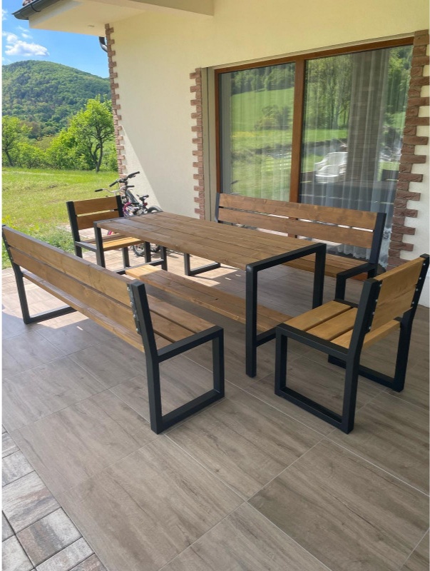 Set je vyrobený z pevnej oceľovej konštrukcie a kvalitného dreva.