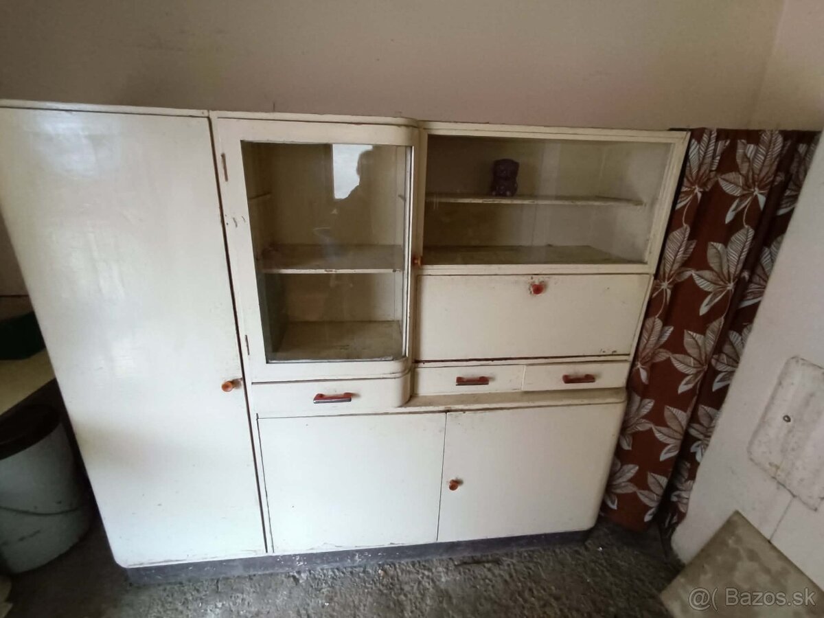 Skrinka je pevná, má sklenené dvierka, úložný priestor a šuplíky. Stav zodpovedá veku – viditeľné známky používania.