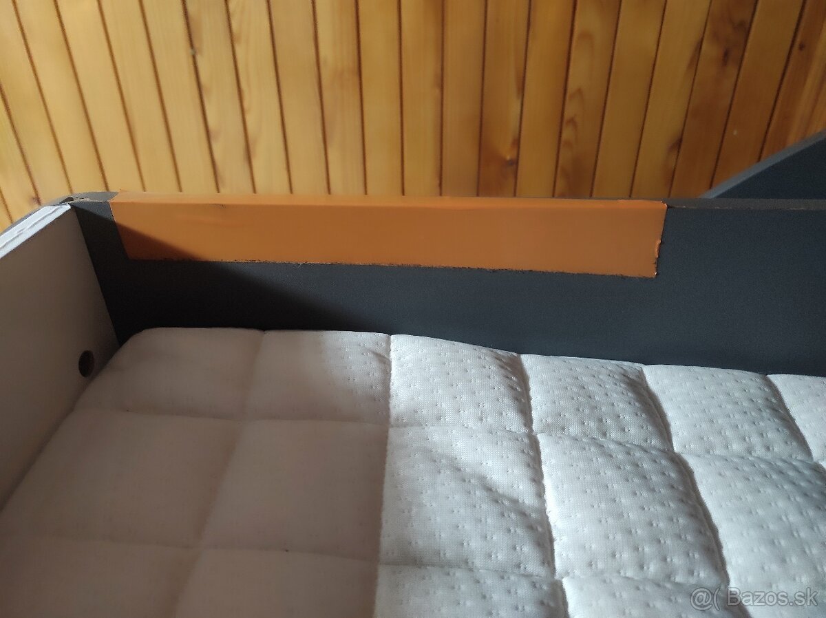 Posteľ bola málo využívaná, skôr len stála, takže je zachovalá. Má pár drobností – na jednom šuplíku je trošku odtrhnutá rúčka a na vrchu postele sa miestami odlepuje sivá farba (nič hrozné, skôr kozmetika).