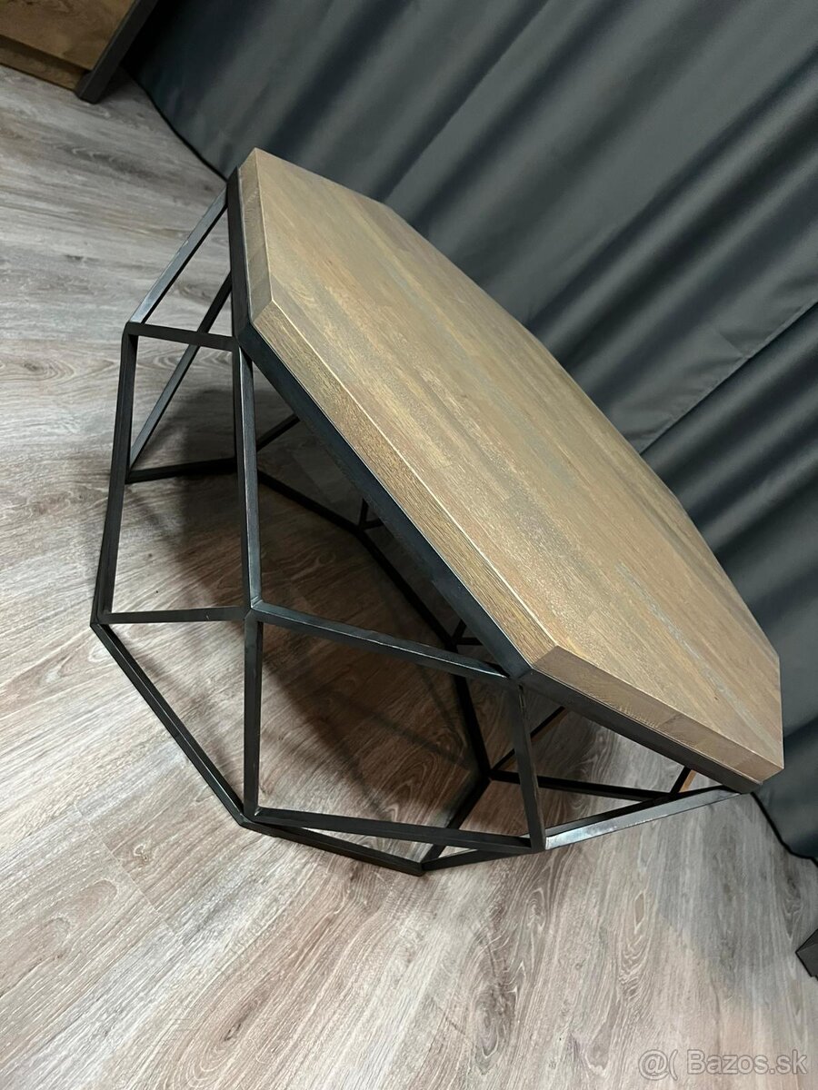 Originálny kus – kombinácia masívnej drevenej dosky a ručne zváranej kovovej konštrukcie v tvare geometrickej siete.