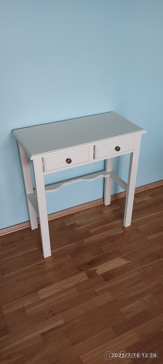 Na predaj príručný stolík v vo farbe slonová kosť vanilka stolík je vyrobený ručne a ihneď k dispozícii ,Rozmery sú šírka 70 hĺbka 35 výška 75cm šuflíky sú na guličkový posuv posielam už v zloženom stave v rámci celej SR alebo osobne v Po ,cena dopravy je 9,90 eur cena stolíka 130 eur,nový ,nepoužívaný. Cena je pevná !!