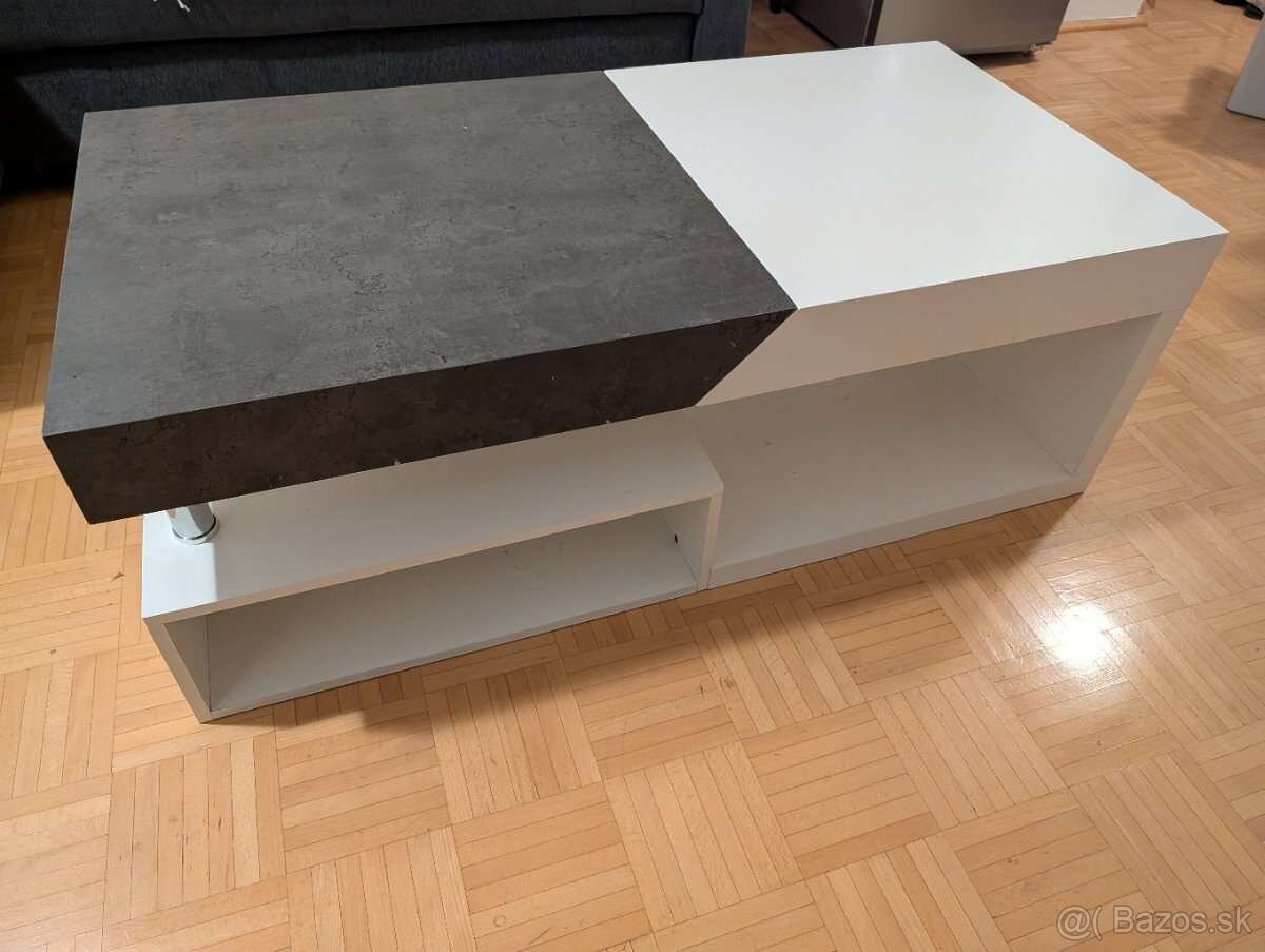 Moderný bielo sivy rozťahovací stolík s úložným otvorom a zásuvkou. Je v zachovalom stave vhodné na ďalšie používanie.