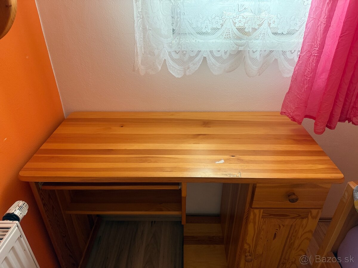 Dobrý deň predám borovicovy stolík z masívu. Má šuflík, skrinku odkladacie miesto na PC a vysúvaciu podložku pre klávesnicu .
