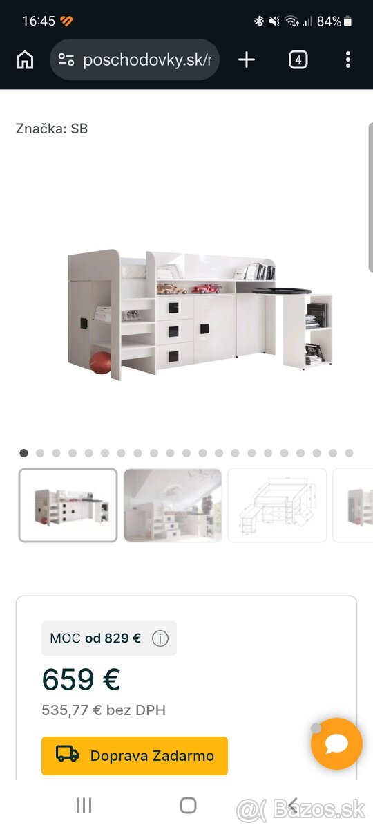 Predám vyvýšenu postel s množstvom úložného priestoru kde súčasťou je aj pisaci stôl (bez matraca)