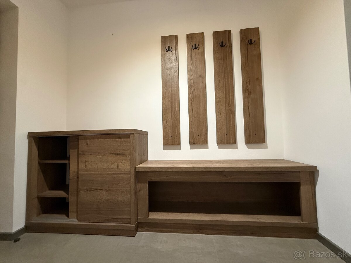 Predám nábytok zo vstupnej chodby. Pozostávajúci z vešiakov. Zo skrinky na topánky a z otvoreného úložného priestoru. Rozmery sú na fotkách. V skrinke s posúvnymi dverami je vyrezaná zadná strana.