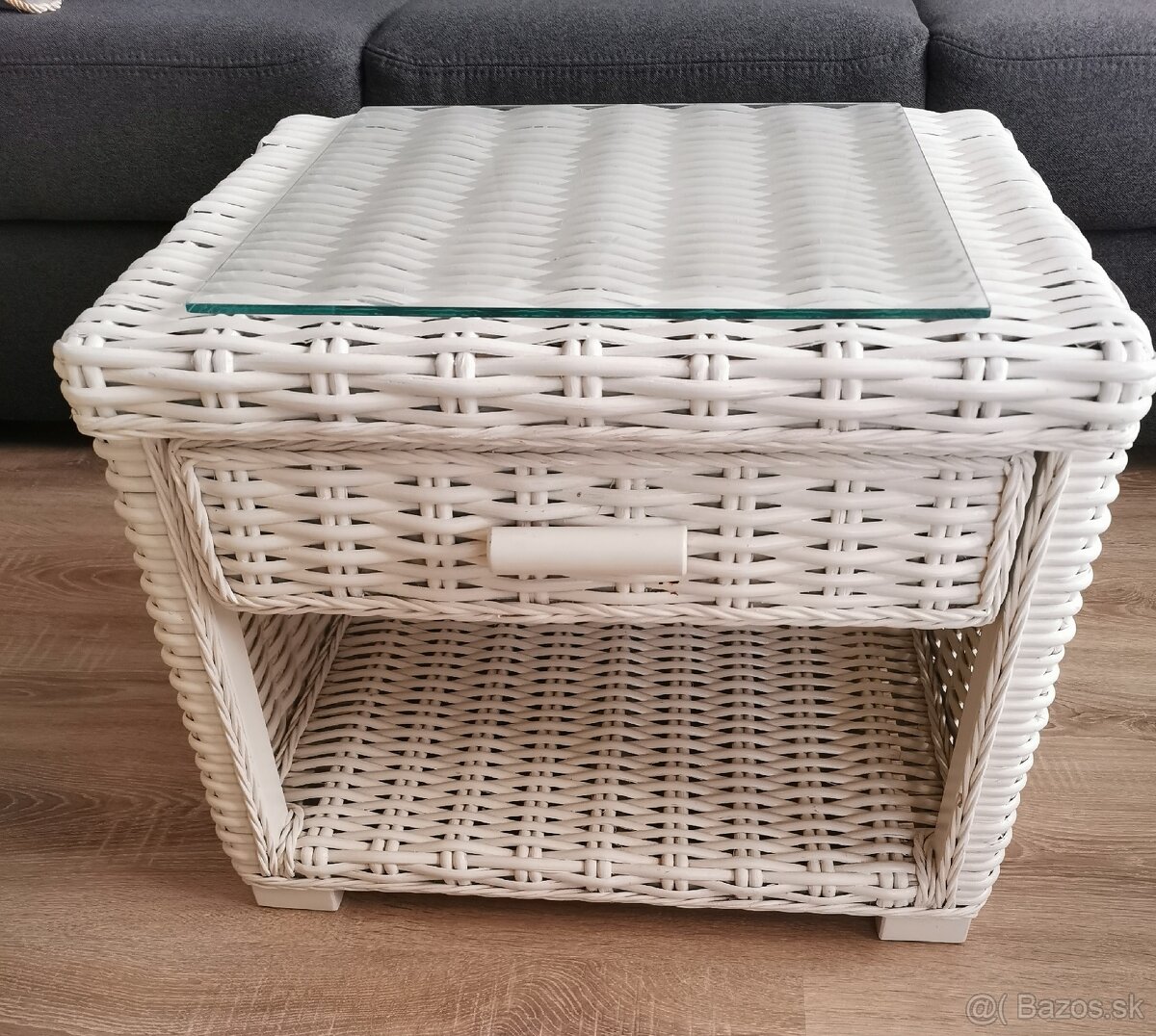 Predám nočný stolík biely so šuflikom, z originál ratanu. Dobre poslúži aj ako konferenčný stolík, ak nemáte priestor alebo príručný stolík. Bez poškodenia, ako nový.