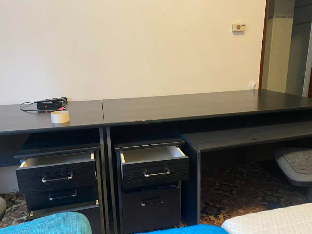Pracovisko zo 4 stolov / pisaci / kancelarsky stol - [10.2. 2026]Predam velke stoly zlozene z dvoch stolov pre dvoch ludi. Jeden stol je urceny pre dvoch. Dva spojene stoly su pre styroch ludi, ale mozu stat aj samostatne. Sirka jedneho dvojstola stola 3,4 metra, hlbka 80 cm, vyska 74 cm. Ku kazdemu dvojstolu su 2 zasuvkove kontajnery s dvomi zasuvkami a dvomi vn ...
