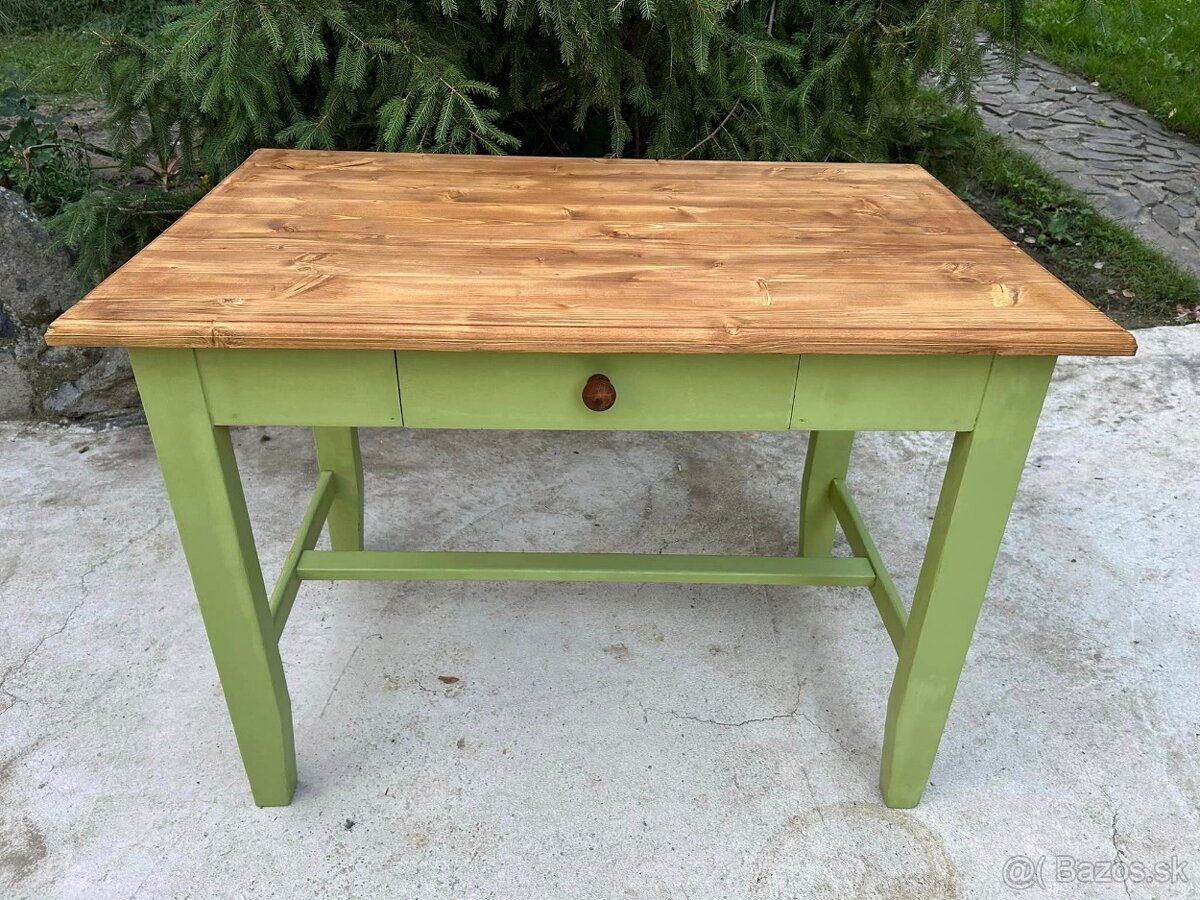 Na predaj vintage stôl v zelenej farbe s plátom v prírodnej farbe.