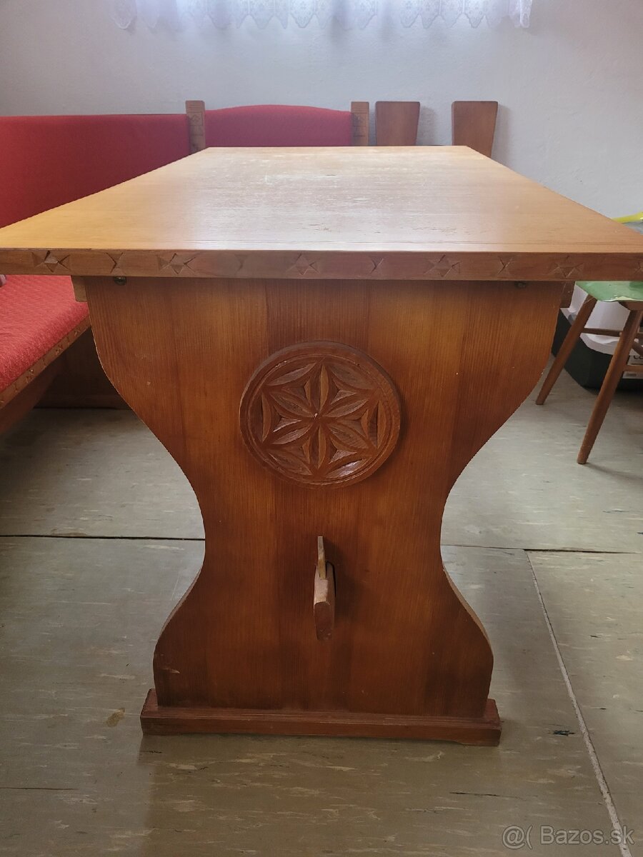 Drevený stôl a 8 stoliciek - [8.3. 2026]Predám ručne vyrobený drevený nabytok, vhodný na chatu, alebo do slovenskej izby. V dobrom stave, možná drobná obnova.