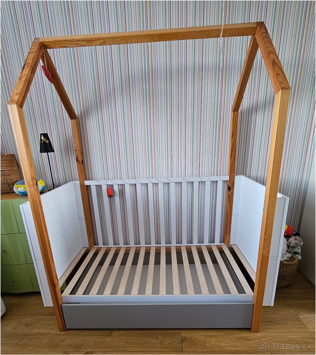výškovo nastaviteľný rošt 140 x 70cm, odnímateľné zábradlie, možnosť nadsavenia dĺžky postele na 160 cm, rozložené na základné diely, + pôvodný návod na montáž k dispozícii.