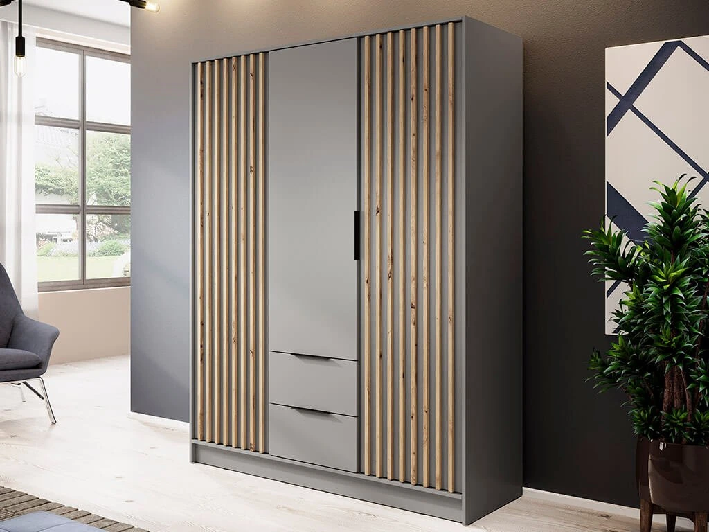 Predám priestrannú 3-dverovú šatníkovú skriňu v modernom prevedení – šedá farba v kombinácii s dekorom lamela dub artisan. Skriňa má 2 praktické zásuvky a je doplnená o samostatný nadstavec, ktorý poskytuje ďalší úložný priestor.