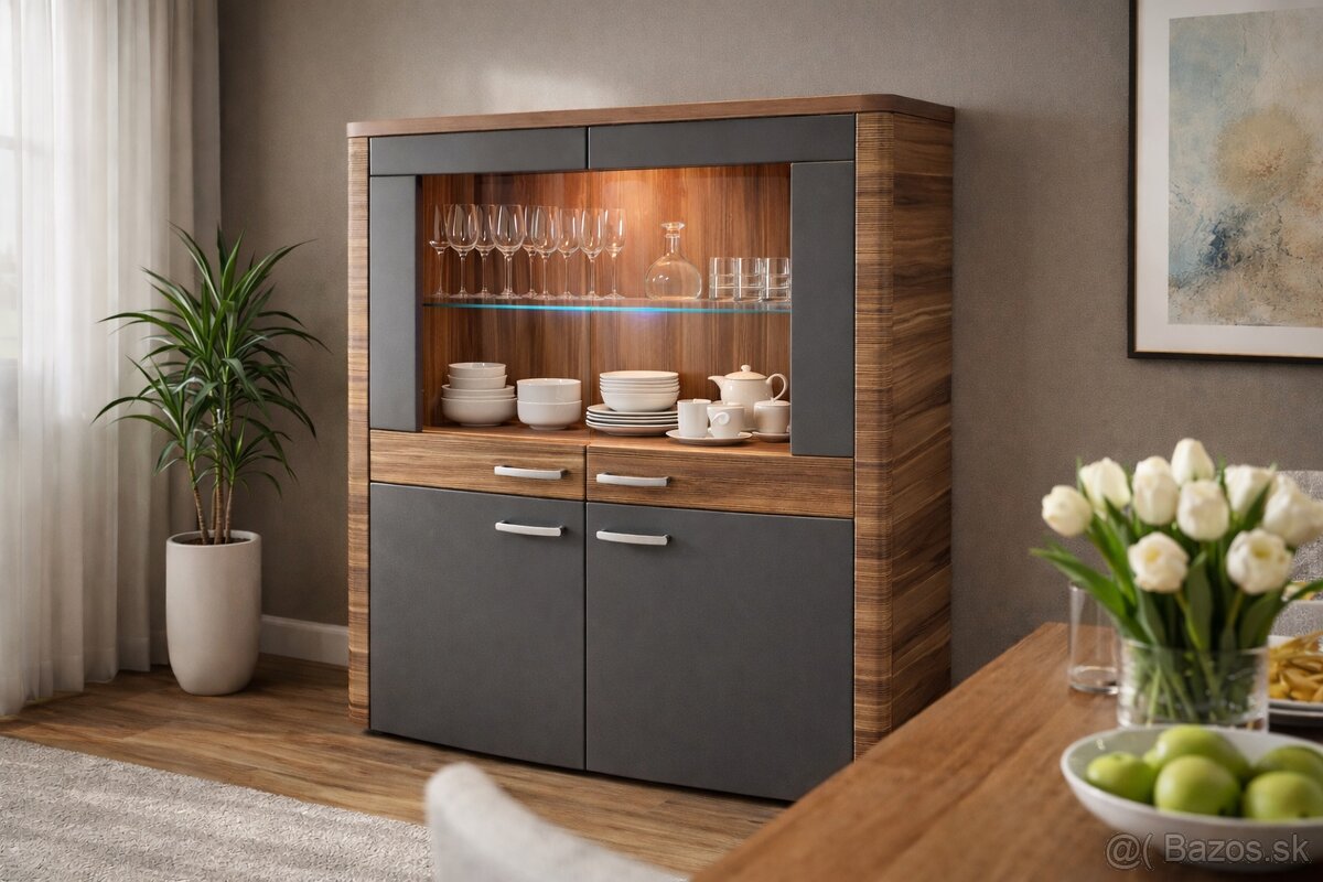 Kombinácia dreveného dekoru a tmavosivých dvierok pôsobí elegantne a hodí sa do modernej jedálne alebo obývačky. Horná časť je presklená s policou – ideálna na poháre, taniere alebo dekorácie. Spodná časť poskytuje dostatok úložného priestoru na riad či iné veci. Súčasťou je aj led osvetlenie.