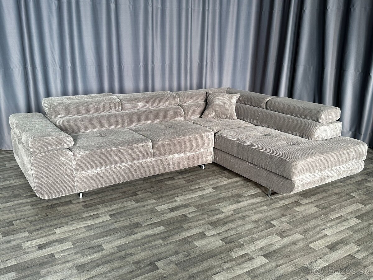 Predám moderný rohový gauč L-ko. Ide o výstavný kus. Rohová sedačka je rozkladacia, má jeden veľký odkladací priestor a má aj polohovateľné opierky hlavy. Pohovka má tvar L.