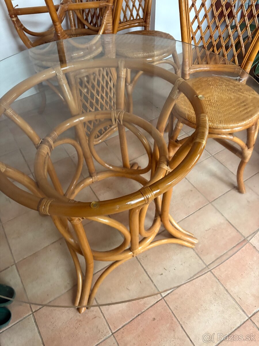 Predam stolik sirka 109 cm a 4 stolicky vhodne na terasu, zimnu a letnu zahradu. Material drevo a ratan. Osobny odber a platba v hotovosti.