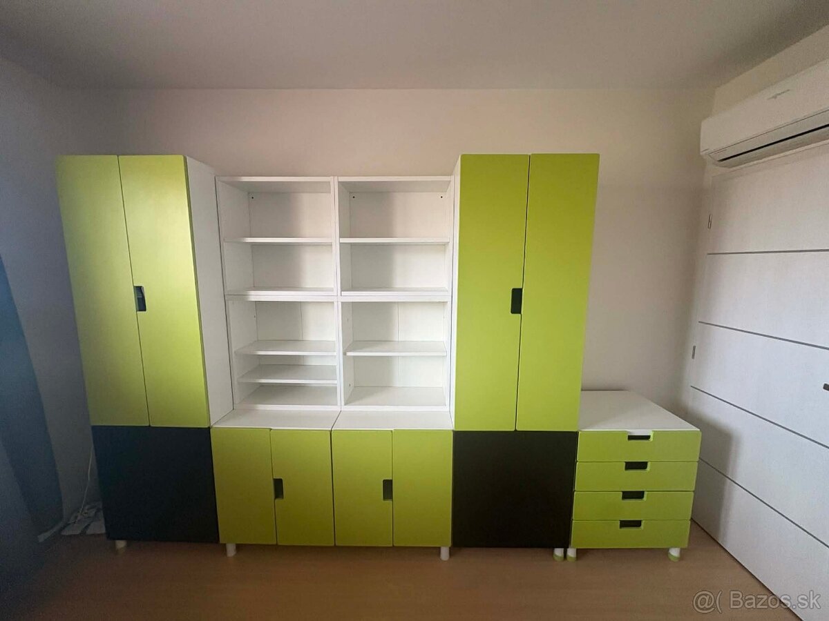 Ponukám zachovalý, nepoškodený detsky nábytok v kombinácii bielo-zeleno černej farby , rozmer zostavy v200 cm x š240cmx h50cm, k zostave je zásuvková skrinka 60x60x50cm a kom óda v rozmere 90x50x50 cm, v zostave sa nachádzajú 4x poličkové skrinky 60x60x30cm, 4x dvier kove skrinky 60x60x50cm a 2x skrinky 130x60x50cm, zostavu a poličky možno usporiadať podľa vlastnej predstavy, nábytok sa da aj rozobrať, iba v celku cena 300€
