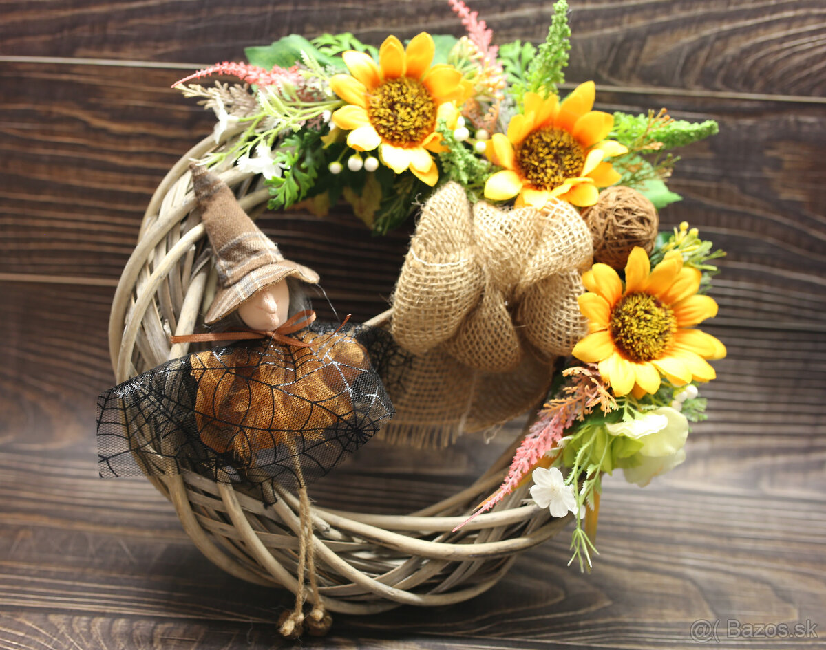 Predám veniec na vchodové dvere naaranžovaný s milou bosorkou na jesenný štýl.Priemer 30 cm.Cena 17e + poštovné.