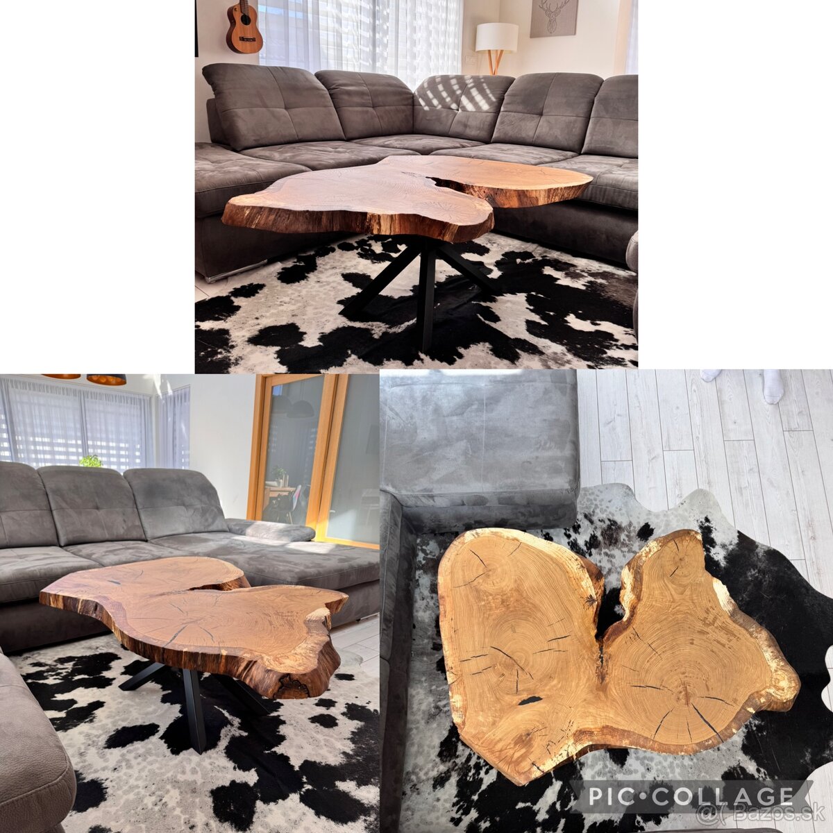 Z dubového dreva. Koláč dvojitý. Rozmer cca 87 x 117 cm . Výška 47 cm .Oceľová podnož. Kvalitný tekutinam odolný akrilovy lak. Čierna epoxidova živica.