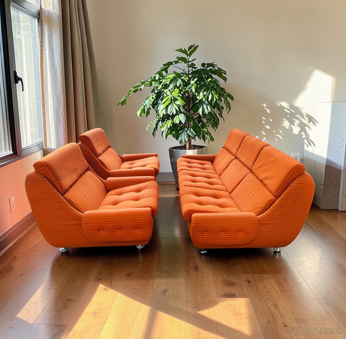 Predám retro sedaciu súpravu škoricovej farby - gauč s 2 kreslami. Gauč aj kreslá sú ľahké, veľmi pohodlné, určené na renováciu.