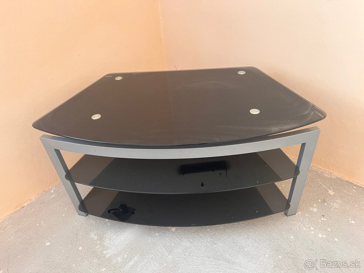Predám rohový TV stolík z čierneho skla s dvomi policami.