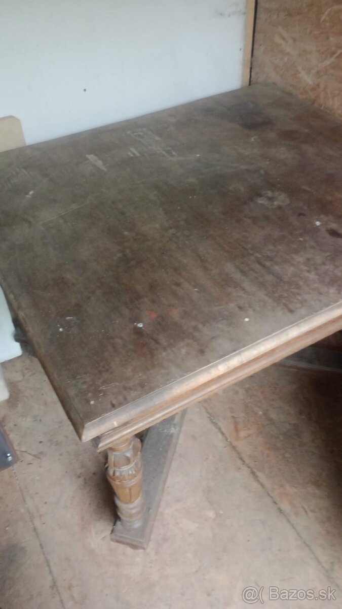 Predám starší drevený stôl so zaujímavými vyrezávanými detailmi na nohách, ideálny ako vintage doplnok do chalupy, dielne alebo na renováciu.