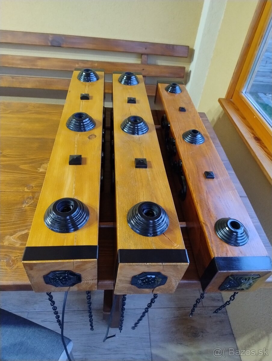 Predám luster drevený hranol objímky ná žiarovky 3xe27/220v rozmery 14x14x100cm +bočné svetlá 30€ posielam aj na dobierku