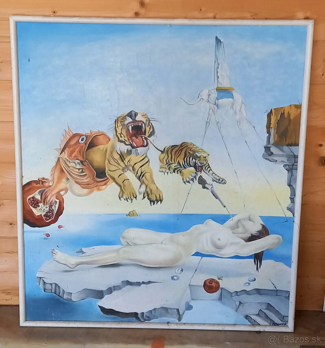 obraz v štýle surrealizmu, maľovaná replika obrazu od Salvadora Dáliho (názov obrazu Sen vyvolaný letom včely okolo granátového jablka), signovaný M.Kováčik, 90x100cm