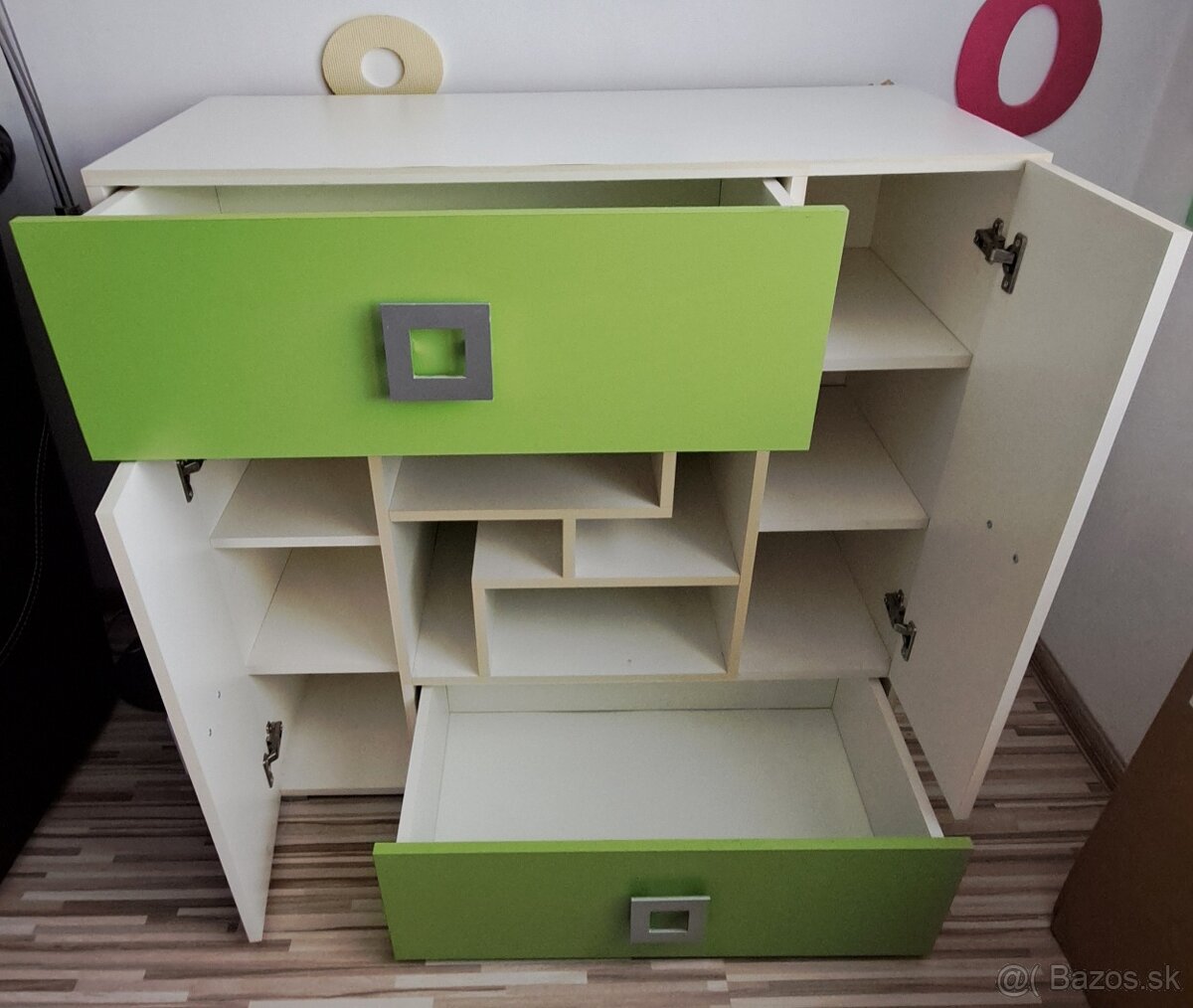Predám detskú komoda bielo zelenej farby s malými chybičkami ale plne funkčná. Rozmer výška 102 cm, šírka 100,5 cm a hĺbka 44,5 cm. Osobný odber BA Ružinov