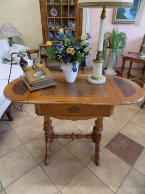 Ponúkam na predaj starožitný rozkladací stolík. Stolík z masívneho dreva so sklopnými intarzovanými doskami.