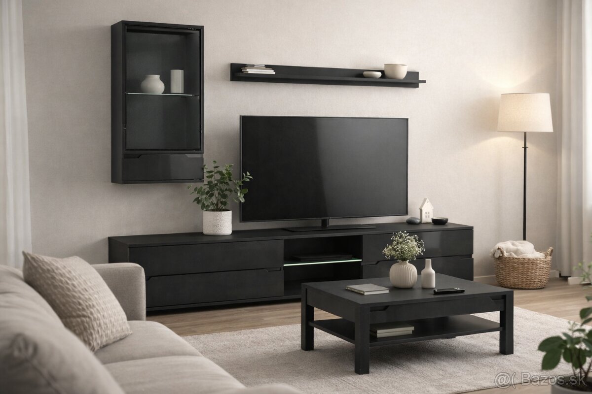 Predám obývaciu stenu Alaska š. 170 cm(prípadne340cm), čiernej farby, dvierka sú z MDF dosky čierna lesklá, LED osvetlenie v cene, pozostáva z troch prvkov: televíznej skrinky, vitrínky na zavesenie a poličky. Stena sa už nevyrába , pôvodná cena 386€ po zľave 169€.( RTV skrinky sú na sklade dve- samostatne stojí 119€, prípadne by sa dala zostaviť stena dlhá 340 cm v cene 288€ ) Stena je nová v pôvodnom balení na sklade v ELBYT nábytku v Žiline. Preferujem vlastný odvoz, doprava po dohode možná- platba pri dodaní.