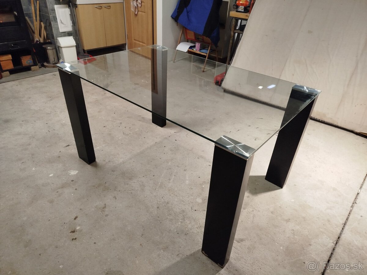 Sklenený jedálenský stôl. Tvrdené sklo, drevené nohy. Nohy na spodnej strane na niektorých miestach olúpané. Rozmer: 140x90x75