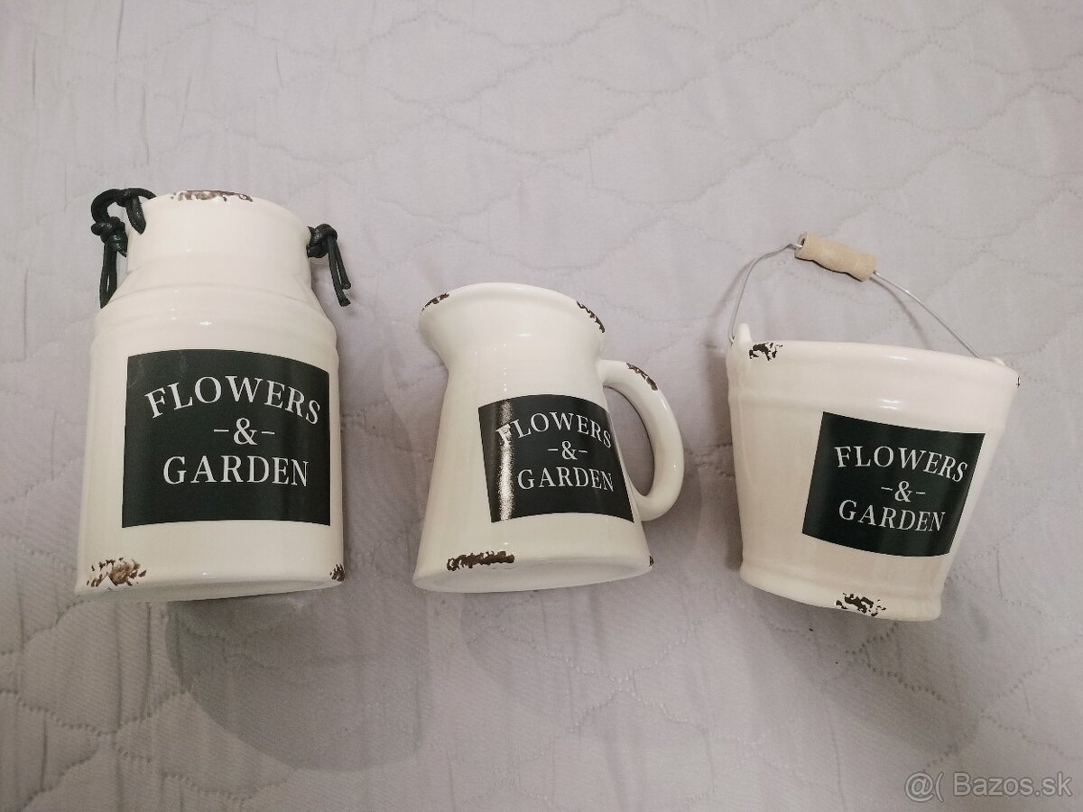 Džbánik rozmer- priemer až 11 cm, výška 12 cm Vedierko rozmer 12 cm, výška 11 cm, konvička rozmer 11 cm, výška 17 cm , pekná sada, úplne nové, vhodné ako darcek, cena za všetky 3 kusy, osobný odber v Žiline, alebo pošlem Packetou