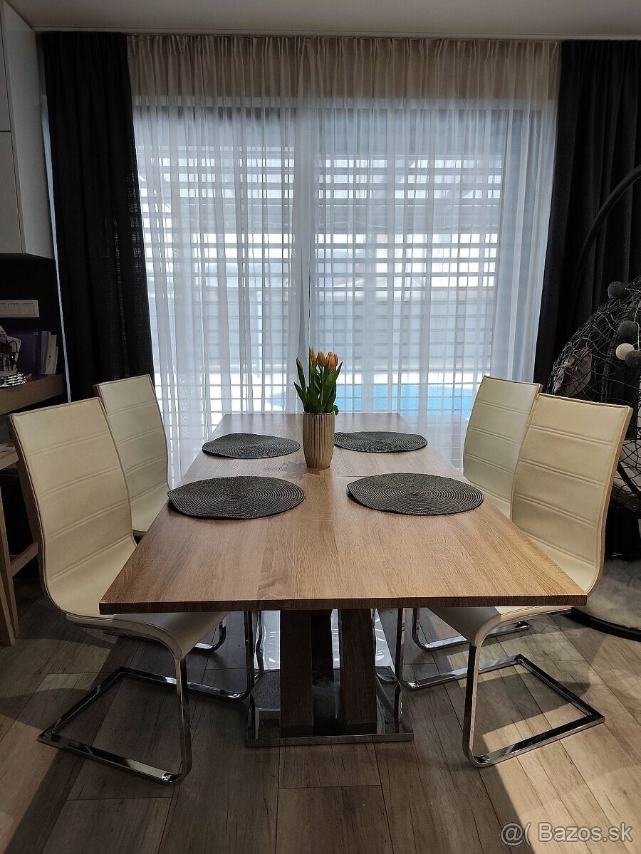 Predám Jedálenský stôl (dub) Stôl je rozkladaci 160-200x90cm. Vyrobený je z MDF materiálu, ktorý nikdy nevyjde z módy. Dôležitou časťou je podnož, ktorá je vyrobená z kvalitnej ocele, vďaka čomu stôl pevne stojí.
