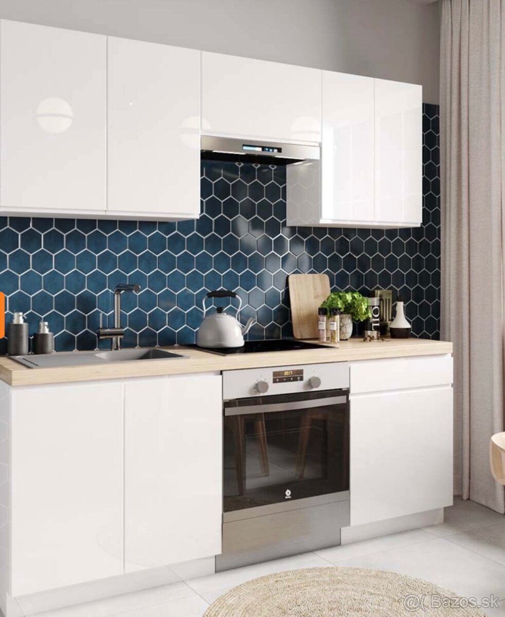 Krásna kuchynská linka (nová ,zabalená v demonte ) dĺžka 200cm ,FREZOVANE ÚCHYTY na dvierkach ,tiché zatváranie dvierok soft-close ,vysoký biely lesk ,dvierka a korpusy 18mm materiálu. Linka je bez pracovnej dosky - vieme dodať ( možnosť rozšírenia linky o dodatkové skrinky aj do tvaru L )