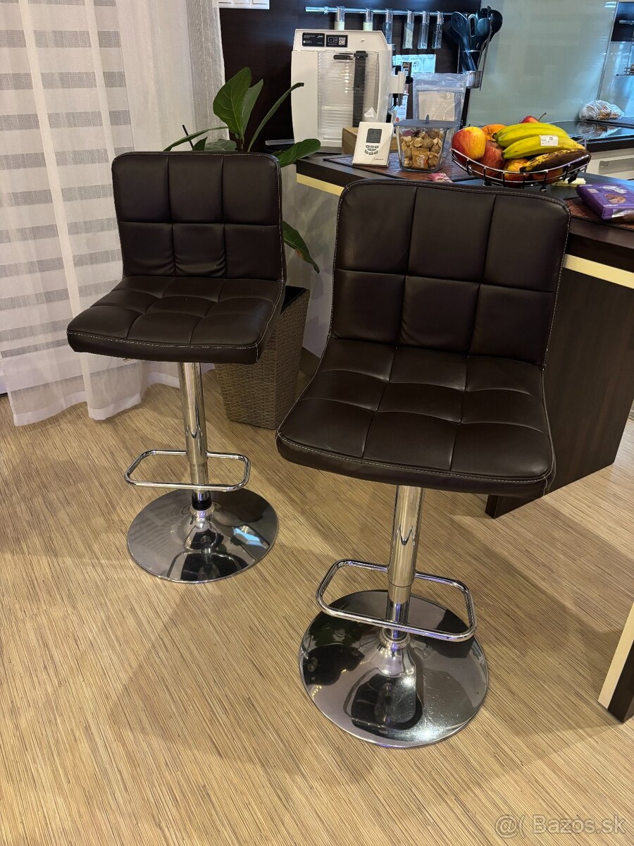 Predám 2 ks barové nastaviteľné stoličky hnedej farby, koženka, bez poškodenia, viď foto
