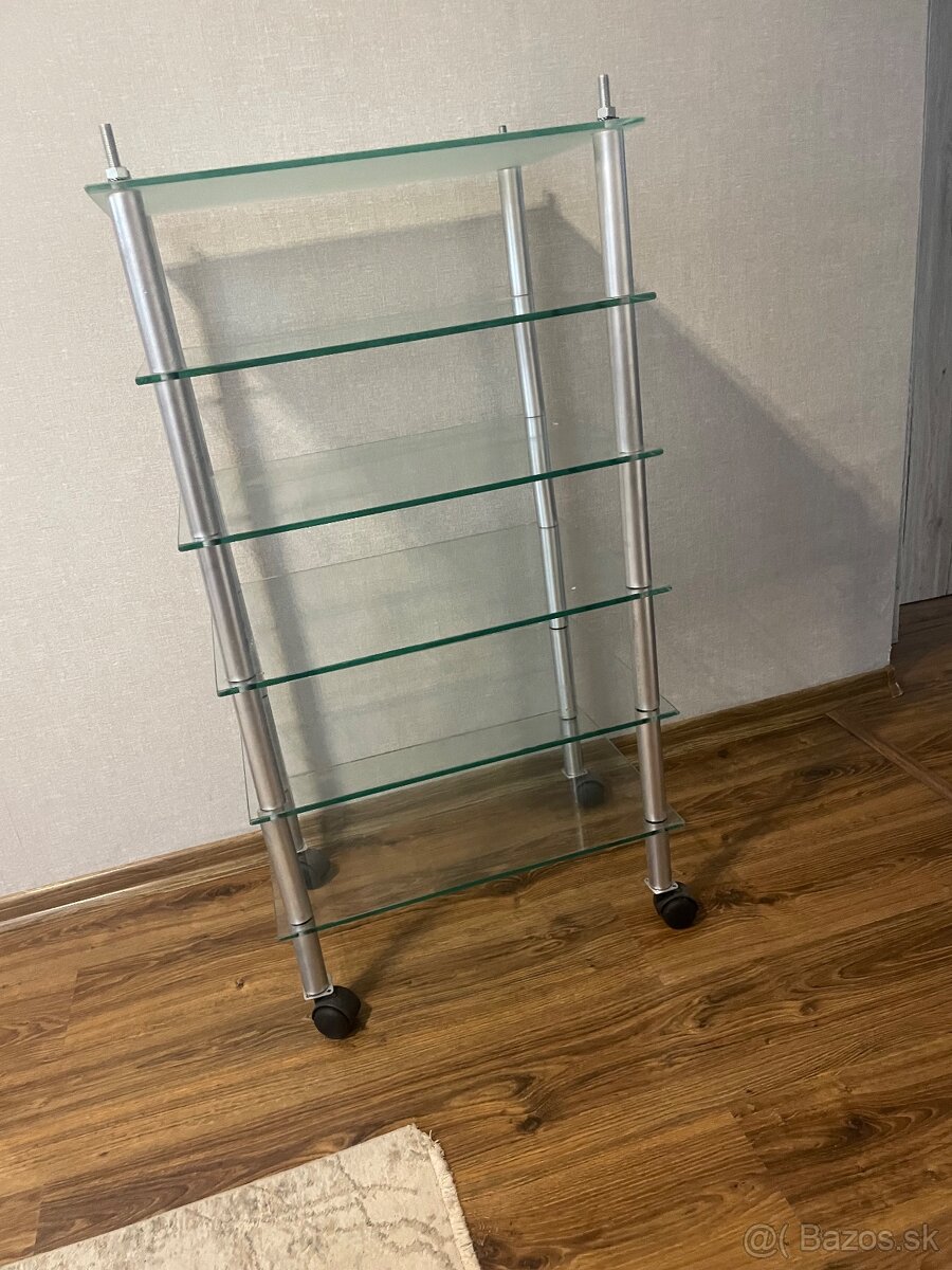 Predám doma robený stojan na HI-FI zostavu v mierne priemyselnom štyle, 6 sklenených políc, horná polica z mliečneho skla, výška cca 105cm, šírka 55cm, hľbka 40cm, na kolieskach, menšie nedokonalosti, osobný odber