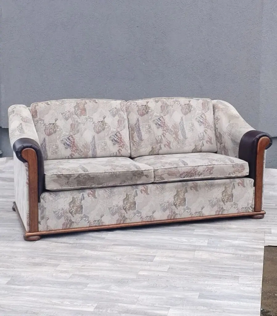 Dvojsedačka retro čalúnená vzorovaným látkovým poťahom s dreveným dubovým rámom a podrúčkami , ktorá má opierky rúk kožené . Vďaka svojej robustnej konštrukcii je veľmi pohodlná a odolná. Túto dvojsedačku je vhodné umiestniť do obývacej izby . Používaná . Výška – 83 cm , šírka – 180 cm , hĺbka – 63 cm , výška sedu – 42 cm , hĺbka sedu – 55 cm .Dovoz Holandsko. Dovoz až k Vám domov viem v rámci Slovenska zabezpečiť po dohovore zadarmo . Pozrite všetky moje inzeráty možno zaujme aj niečo iné. Uprednostňujem telefonický kontakt pred sms a emailmi. Všetko je o dohode.