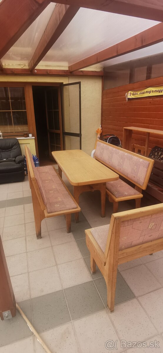 Predám lavice a stoly z tvrdého dreva,čalúnené 5 kompletov, vhodné do reštaurácie,na terasu, do altánku, atď. Lavice štvormiestné dlž. 190cm, lavice d 180cm,v 78cm.