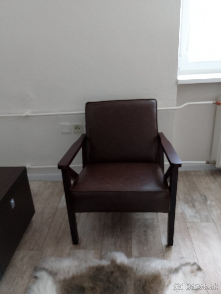 Predám nové kreslo z umelej kože s drevenými područkami.Šírka sedu 55cm, hľbka sedu 50cm, výška opierky 45cm, výška sedu 43cm