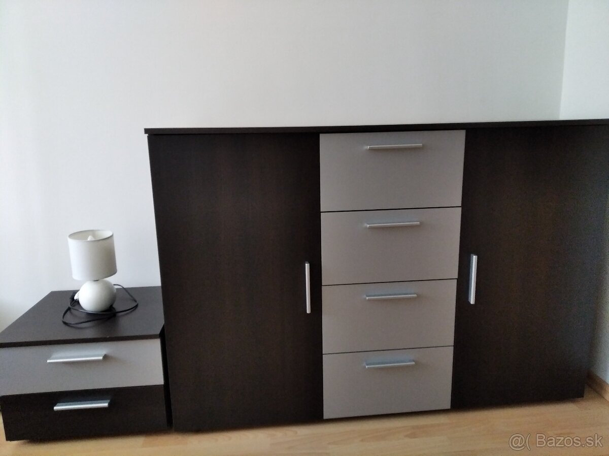 Predám manželskú posteľ s matracom, komodu a 2 nočné stolíky. Farba sivočierna, rozmery: